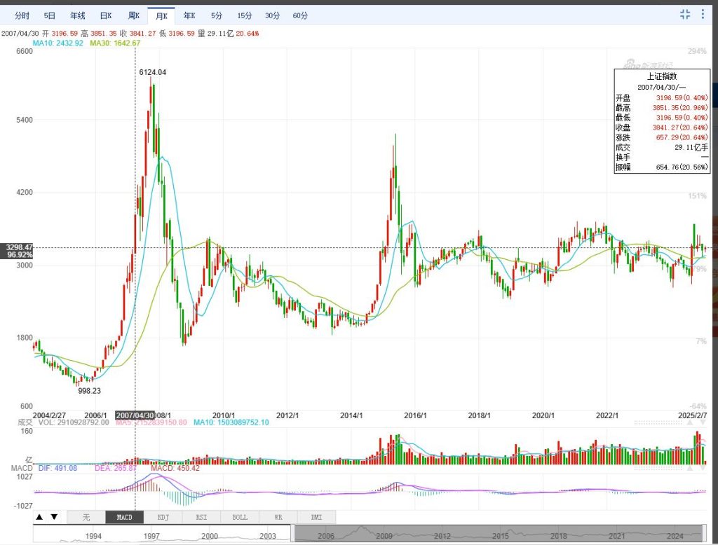 中国股市素来有“3000点保卫战“,而且持续达十数年之久。这是令人可惜,毕竟作为个体人,短暂的一生,没有几个十年可以裹足不前地平稳度过,实际上都是逆水行舟不进则退的奋力拼搏。可是中国股市却几乎长达20年的横盘不涨。比如下图所示,2025年2月7日收盘上证3303点,这个价格点位上一次是2007年4月的点数,也就是说,过去长达十八年之久,上证指数在3000点原地踏步。