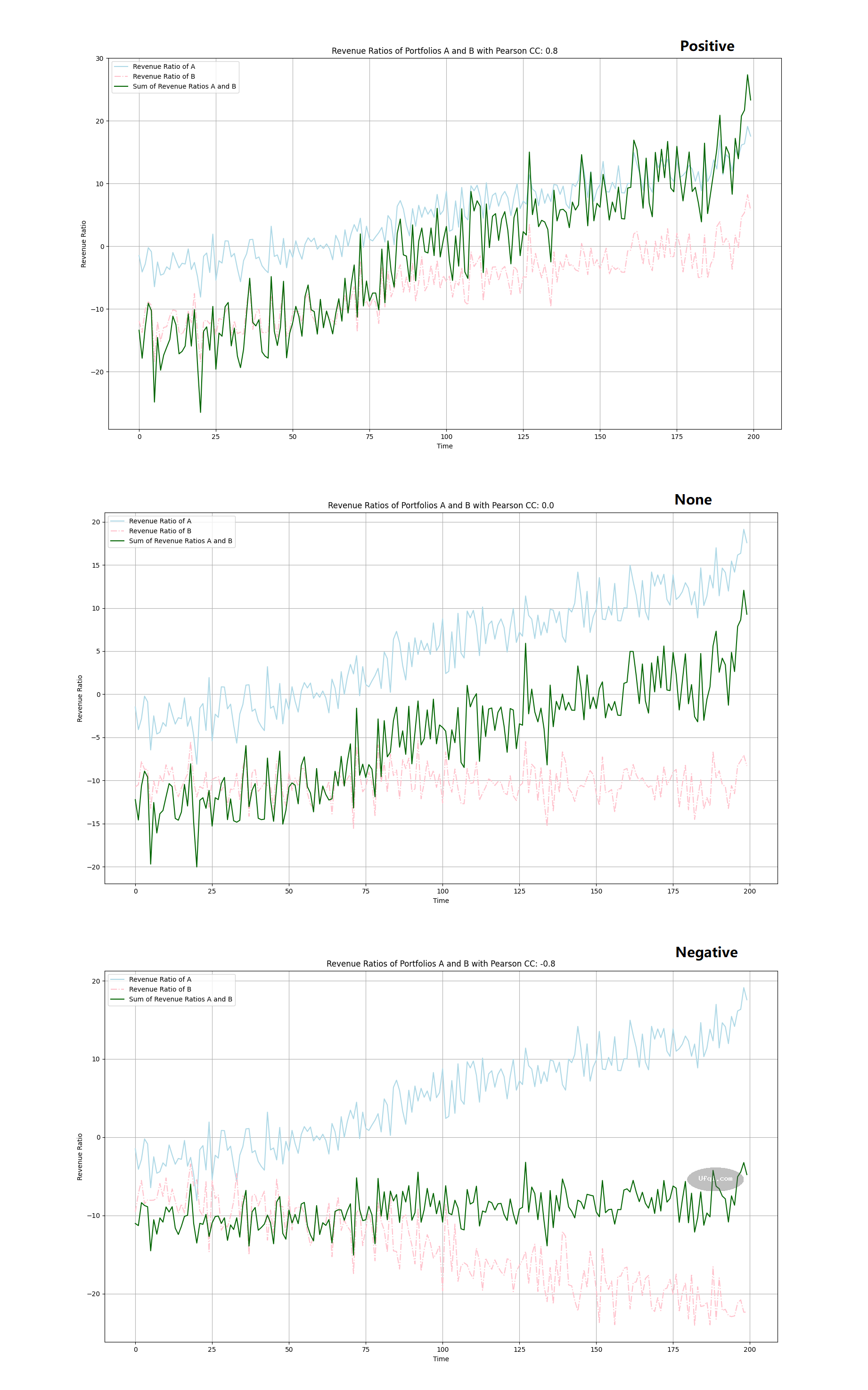 由此前一节A1的讨论,我们能够得出结论,如果一个投资组合要获得正收益,也即图中的深绿色曲线要在震荡中不断上扬(上涨),那么就需要资产组合中的各个资产之间的相关性系数不能是强负相关。保持投资组合中的各个资产自己的相关性系数是不相关、弱相关或者强正相关,才有可能使得投资组合的整体收益随着时间的推移不断上涨,上图Fig03.中,有两条深绿色曲线上扬的情况,Pearson CC 数值分别是 0.8, Positive, 强正相关, 0.0 Non-Correlation, 不相关,或者弱相关( -0.3 ~ 0.3 )。