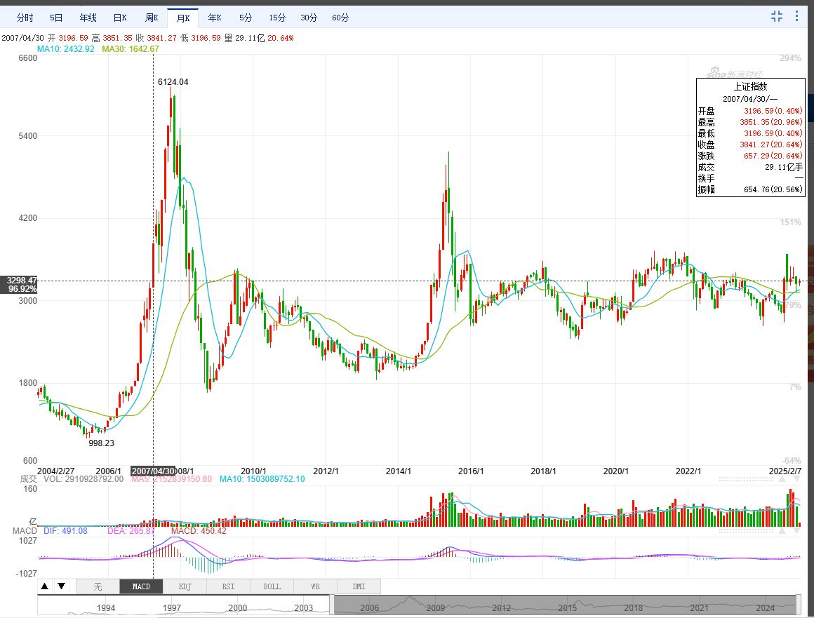 中国股市素来有“3000点保卫战“,而且持续达十数年之久。这是令人可惜,毕竟作为个体人,短暂的一生,没有几个十年可以裹足不前地平稳度过,实际上都是逆水行舟不进则退的奋力拼搏。可是中国股市却几乎长达20年的横盘不涨。比如下图所示,2025年2月7日收盘上证3303点,这个价格点位上一次是2007年4月的点数,也就是说,过去长达十八年之久,上证指数在3000点原地踏步。